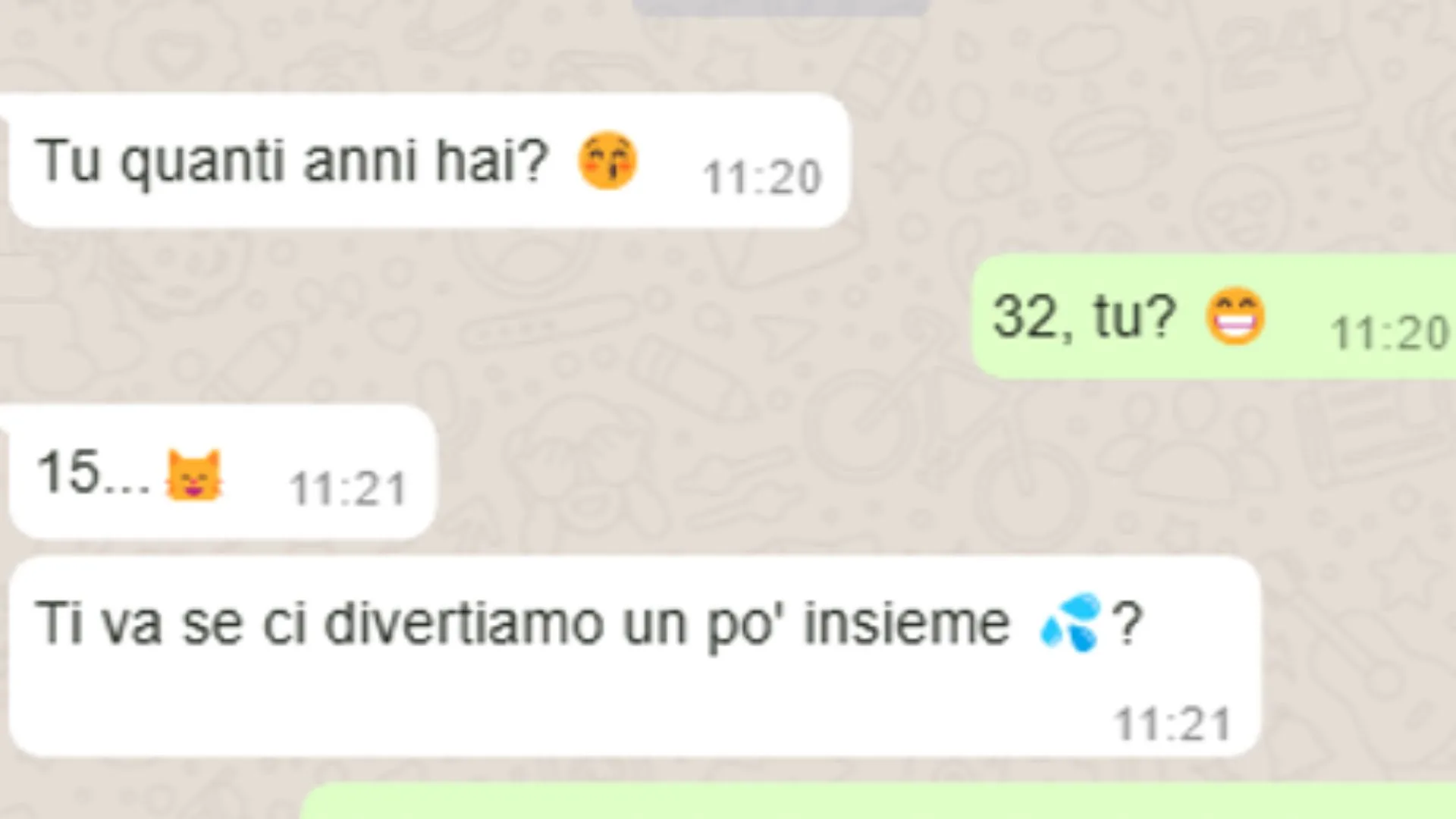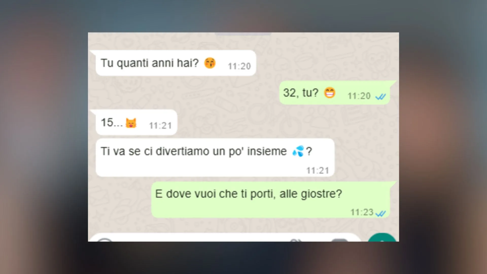 Questa chat inizia con una domanda apparentemente innocente: "Tu quanti anni hai?" Un messaggio che potrebbe apparire normale, ma che nasconde un potenziale sottotesto ambiguo. La risposta dell'interlocutore, "32, tu?", viene seguita da un "15..." che immediatamente solleva una bandiera rossa. A questo punto, il nostro lettore, piuttosto che lasciarsi trascinare in una conversazione ambigua, risponde in modo sarcastico con "E dove vuoi che ti porti, alle giostre?" – una risposta brillante che sdrammatizza e chiarisce il suo intento senza cadere in trappole.